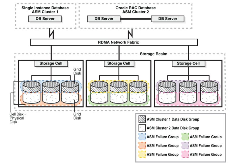 The storage servers in the grid use an RDMA Network Fabric network (Infiniband) to connect to the database servers that have a single-instance database or Oracle Real Application Clusters (Oracle RAC) database installation.